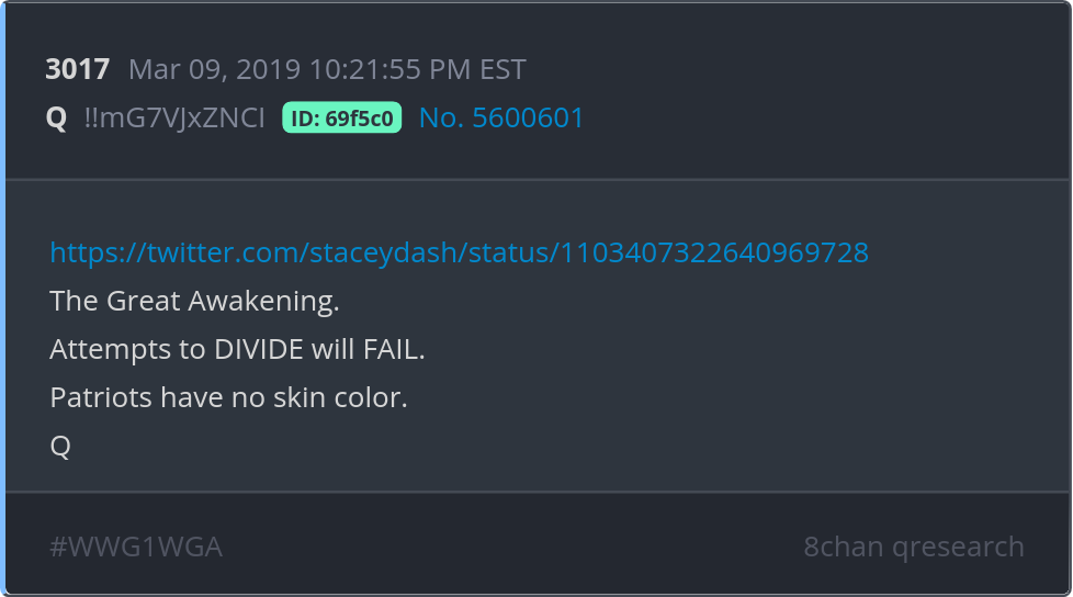 The Great Awakening. Attempts to DIVIDE will FAIL. Patriots have no skin color. https://twitter.com/staceydash/status/1103407322640969728 Posted 03/08/2026 08:11 PM Categories Clips, Q