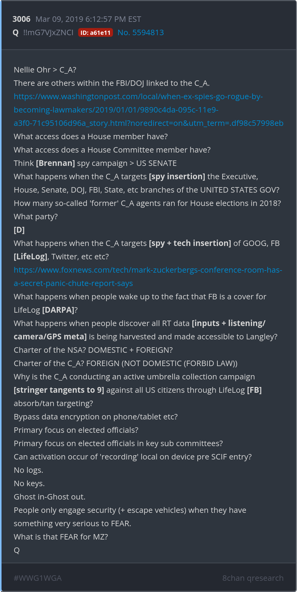 What happens when people wake up to the fact that FB is a cover for LifeLog [DARPA]? What happens when people discover all RT data [inputs + listening/camera/GPS meta] is being harvested and made accessible to Langley? https://www.washingtonpost.com/local/when-ex-spies-go-rogue-by-becoming-lawmakers/2019/01/01/9890c4da-095c-11e9-a3f0-71c95106d96a_story.html?noredirect=on&utm_term=.df98c57998eb https://www.foxnews.com/tech/mark-zuckerbergs-conference-room-has-a-secret-panic-chute-report-says Posted 03/08/2026 08:16 PM Categories Clips, Q