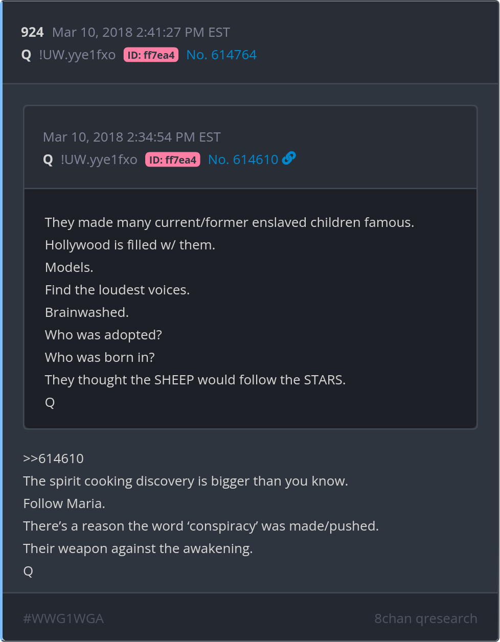 The spirit cooking discovery is bigger than you know. Follow Maria. There’s a reason the word ‘conspiracy’ was made/pushed. Their weapon against the awakening. Posted 03/09/2026 09:55 PM Categories Clips, Q