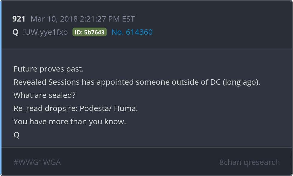 Future proves past. Revealed Sessions has appointed someone outside of DC (long ago). What are sealed? Re_read drops re: Podesta/ Huma. You have more than you know. Posted 03/09/2026 09:56 PM Categories Clips, Q