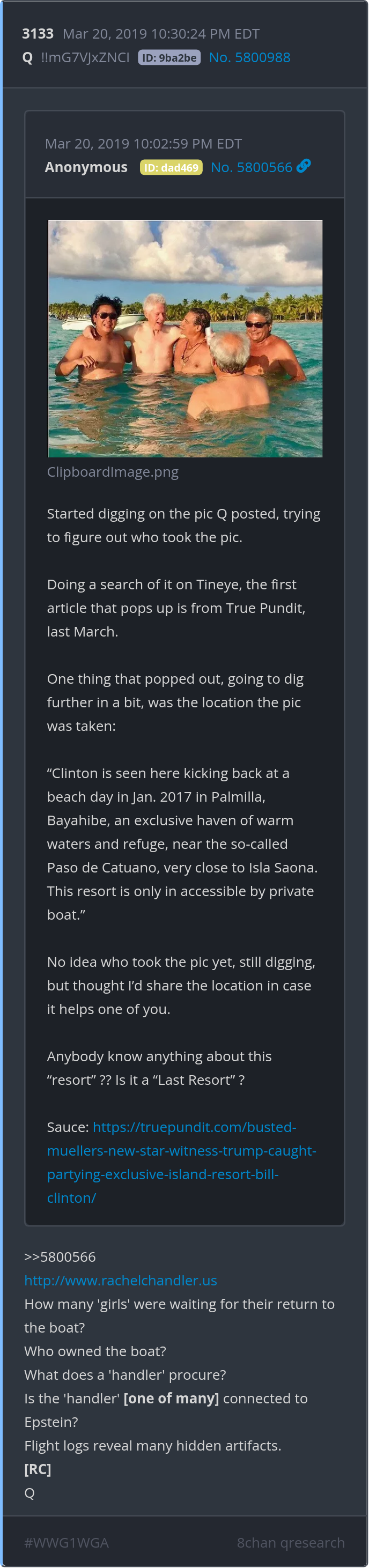 What does a 'handler' procure? Is the 'handler' [one of many] connected to Epstein? https://truepundit.com/busted-muellers-new-star-witness-trump-caught-partying-exclusive-island-resort-bill-clinton/ http://www.rachelchandler.us/ Posted 03/19/2026 07:56 PM Categories Clips, Q