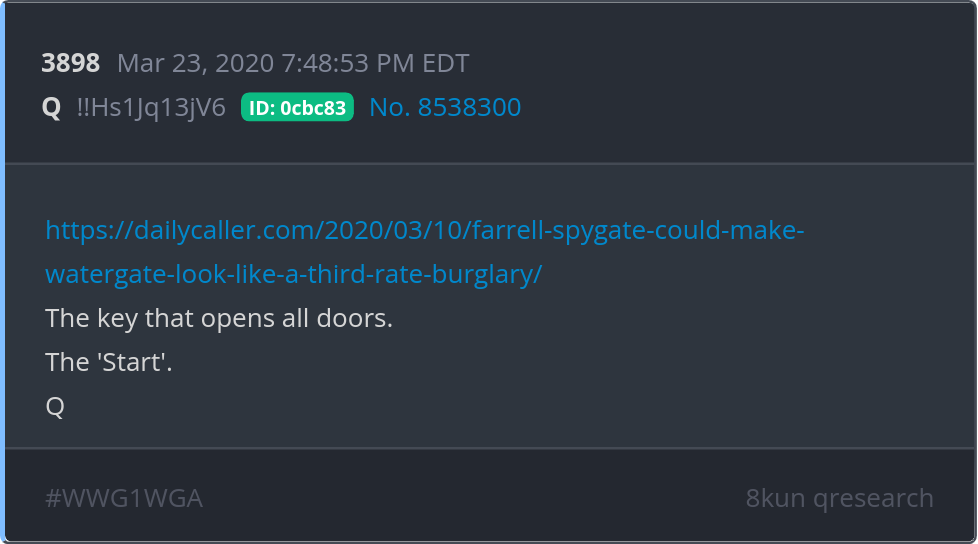 The key that opens all doors. The 'Start'. https://dailycaller.com/2020/03/10/farrell-spygate-could-make-watergate-look-like-a-third-rate-burglary/ Posted 03/22/2026 08:50 PM Categories Clips, Q