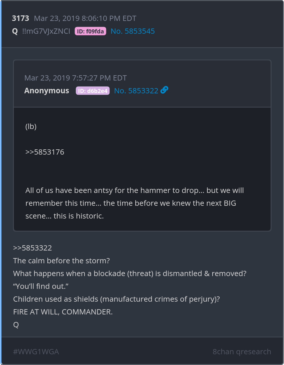 What happens when a blockade (threat) is dismantled & removed? “You’ll find out.” Posted 03/22/2026 08:54 PM Categories Clips, Q