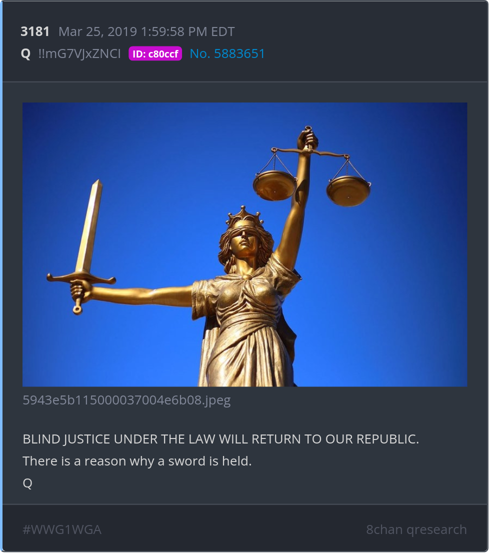 BLIND JUSTICE UNDER THE LAW WILL RETURN TO OUR REPUBLIC. There is a reason why a sword is held. Posted 03/24/2026 09:06 PM Categories Clips, Q