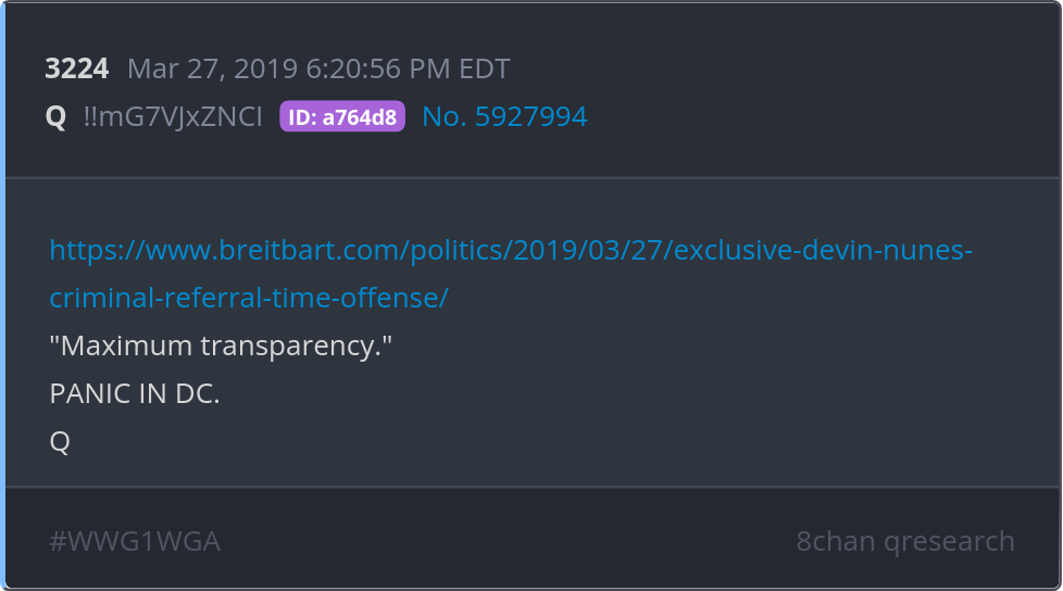 "Maximum transparency." PANIC IN DC. https://www.breitbart.com/politics/2019/03/27/exclusive-devin-nunes-criminal-referral-time-offense/ Posted 03/26/2026 08:03 PM Categories Clips, Q