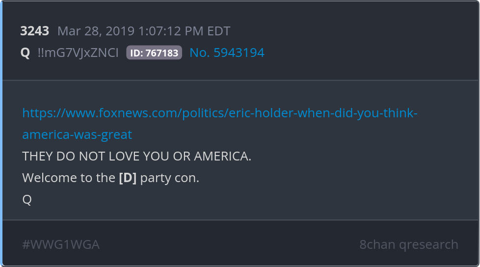 THEY DO NOT LOVE YOU OR AMERICA. Welcome to the [D] party con. https://www.foxnews.com/politics/eric-holder-when-did-you-think-america-was-great Posted 03/27/2026 08:45 PM Categories Clips, Q