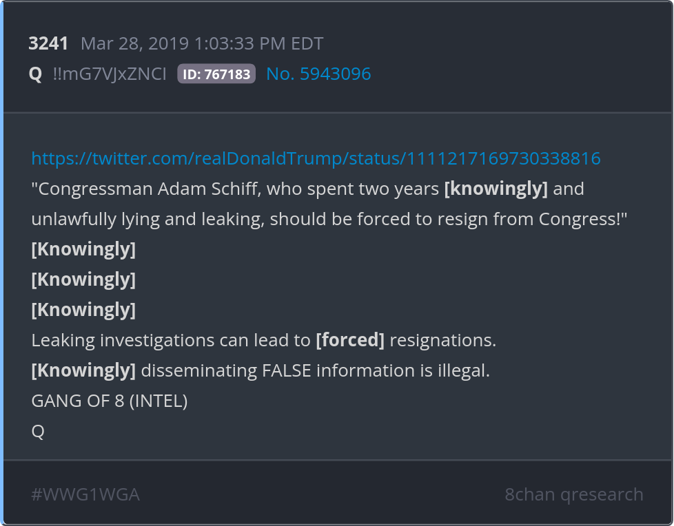 [Knowingly] disseminating FALSE information is illegal. https://twitter.com/realDonaldTrump/status/1111217169730338816 Posted 03/27/2026 08:46 PM Categories Clips, Q