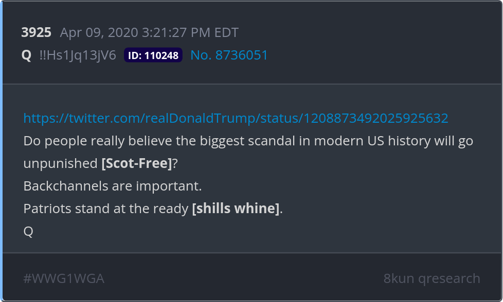 Do people really believe the biggest scandal in modern US history will go unpunished [Scot-Free]? Backchannels are important. Patriots stand at the ready [shills whine]. https://twitter.com/realDonaldTrump/status/1208873492025925632 Posted 04/09/2026 09:31 AM Categories Clips, Q