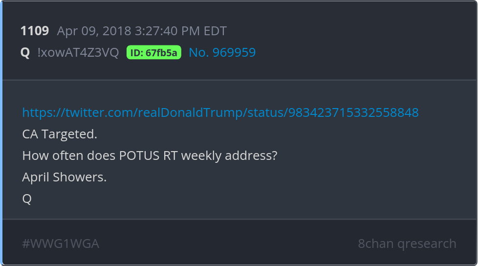 CA Targeted. How often does POTUS RT weekly address? April Showers. https://twitter.com/realDonaldTrump/status/983423715332558848 Posted 04/09/2026 09:41 AM Categories Clips, Q