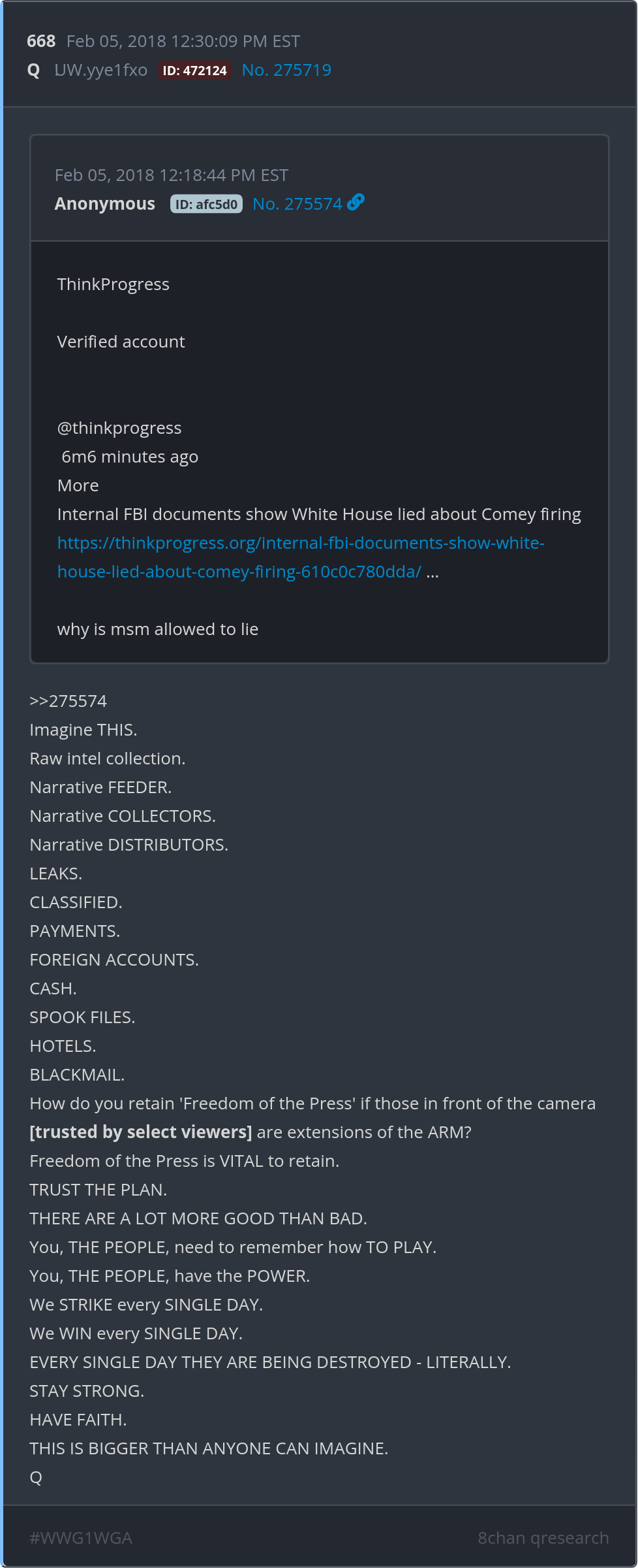 5 years ago today, that “kid in the basement” posted a link to Jim Comey’s Tweet filled with lies about “good people trying to protect America”
