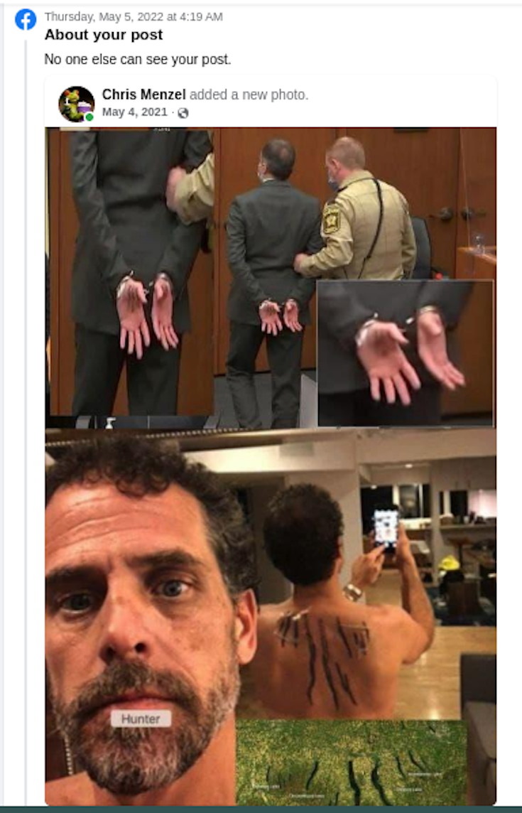 This morning I woke to the news that facebook had restricted my account and censored one of my posts. I can’t broadcast live for 27 days. Bummer. I do that so often. But it is nice to know that Facebook cares. Why? They say I posted an ‘intimate’ image that goes against their community standards. I suppose so if you consider protecting the presidents son at all costs your community standards.