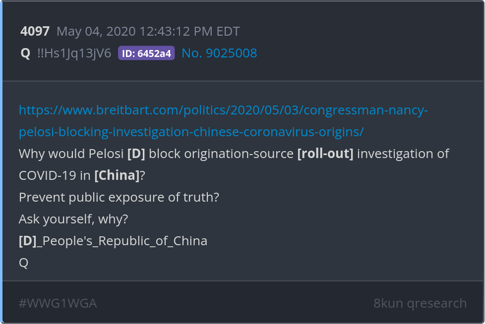Why would Pelosi [D] block origination-source [roll-out] investigation of COVID-19 in [China]? Prevent public exposure of truth? Ask yourself, why?