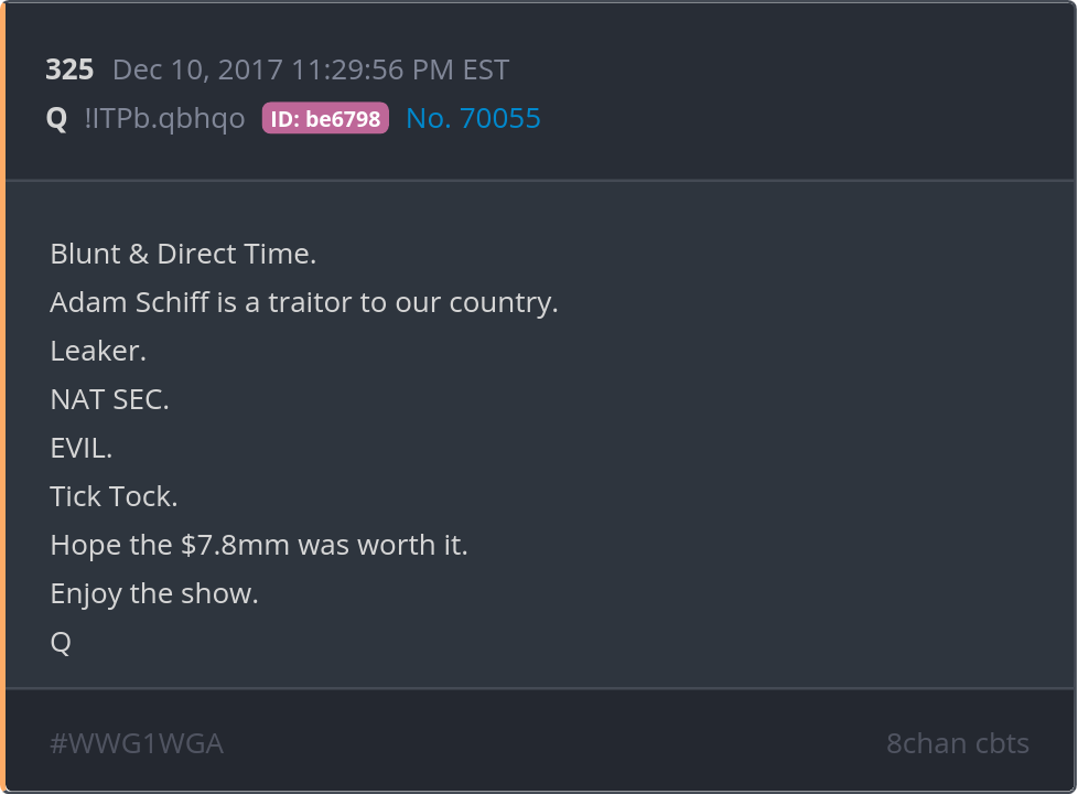 Blunt & Direct Time. Adam Schiff is a traitor to our country. Leaker. NAT SEC. EVIL. Tick Tock. Hope the $7.8mm was worth it. Enjoy the show.