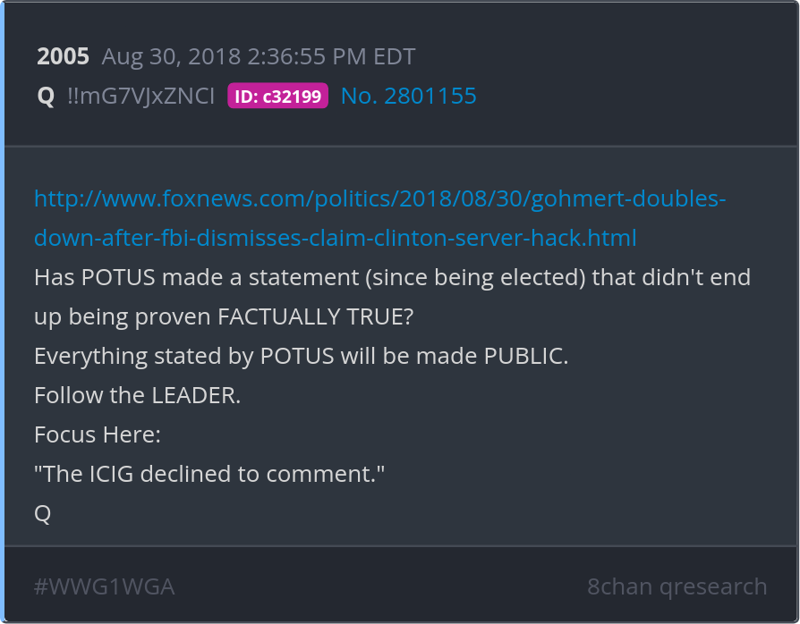 Has POTUS made a statement (since being elected) that didn't end up being proven FACTUALLY TRUE? Everything stated by POTUS will be made PUBLIC. Follow the LEADER. Focus Here: "The ICIG declined to comment."