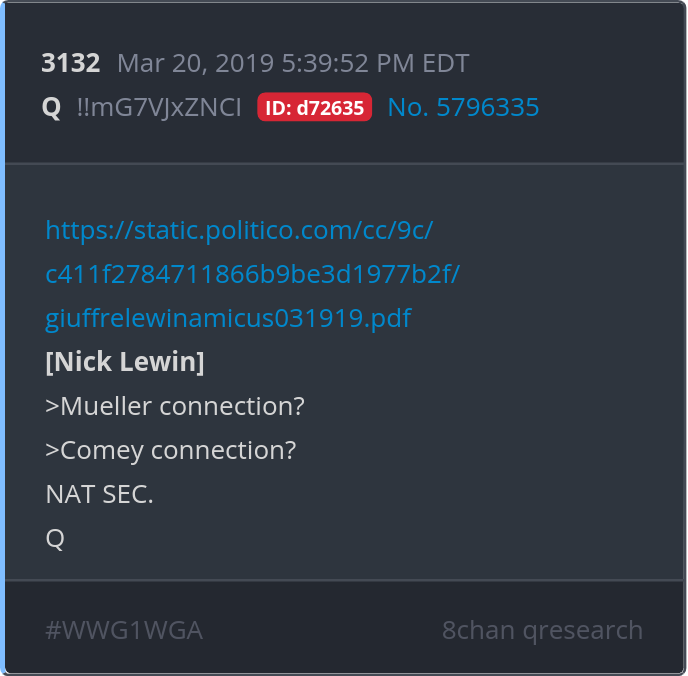 [Nick Lewin] >Mueller connection? >Comey connection? NAT SEC.
